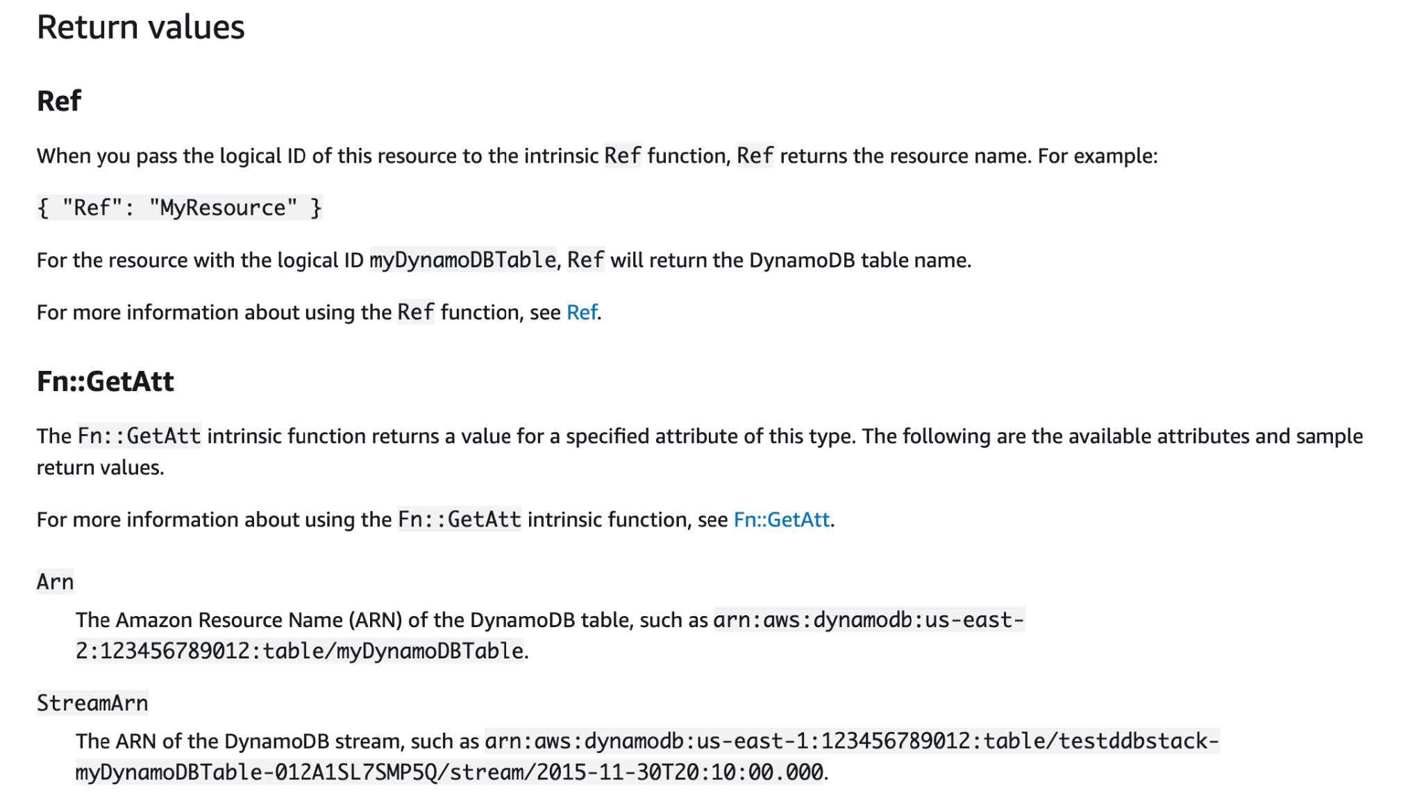 A full list of these functions with examples can be found in the AWS docs here. The two I’ve most commonly worked with are Ref and Fn::GetAtt, as they’re used to link resources together, like subnets to a VPC or security groups to an EC2 instance. However, it can sometimes be confusing to know if a property requires a value returned by Ref or Fn::GetAtt, such as a resource ARN. For some resources, it’s returned by Ref, while for others it’s returned by Fn::GetAtt. Using the AWS CloudFormation documentation is quite helpful here, as it provides a section detailing what information is returned by which function. Near the bottom of the webpage for each resource type is a section called “Return Values”, where you can see those values. For example, Ref returns the table name of a DynamoDB table resource, so you’d need to use Fn::GetAtt for the ARN, as shown below.