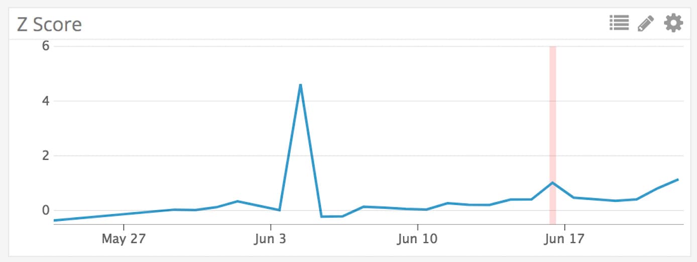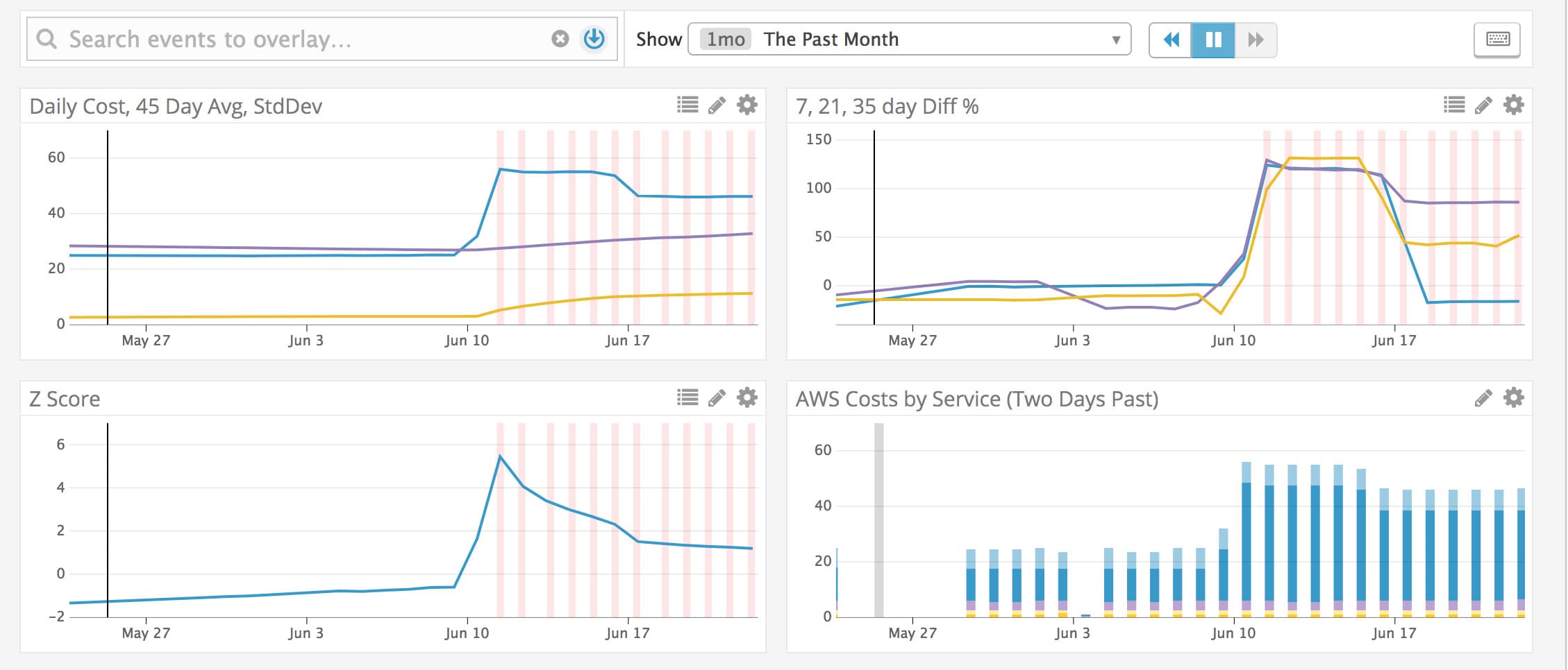 The graph above shows the z-score for one of our internal accounts over the last few days. You’ll notice there’s no red line indicating an alert for that big spike in the graph in early June. That’s because the cost increase did not last long enough to be of concern. The red line later in the month is actually catching a slow-growing change — in this case, because we were accumulating some resources in the account that weren’t getting cleaned up.