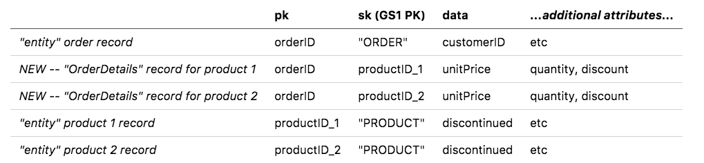 What does this get us? We now have the ability to query the primary table partition to get all products in an order. We can query the GS1 PK to do a reverse lookup on all the orders of a given product. This is the adjacency list pattern. You can try it yourself with the "EmployeeTerritories" join table in the Northwind data, which we haven't included here. You may need to break this access pattern out into its own GSI if you take it much further.