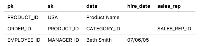 Not only is our “key-value store” schema-less; in a way, it’s also keyless. We need to get used to thinking of the attribute names on a DynamoDB item as arbitrary. Our “partition key” attribute on the table may contain a different type of value depending on whether it’s an Order, a Product, an Employee, or whatever: