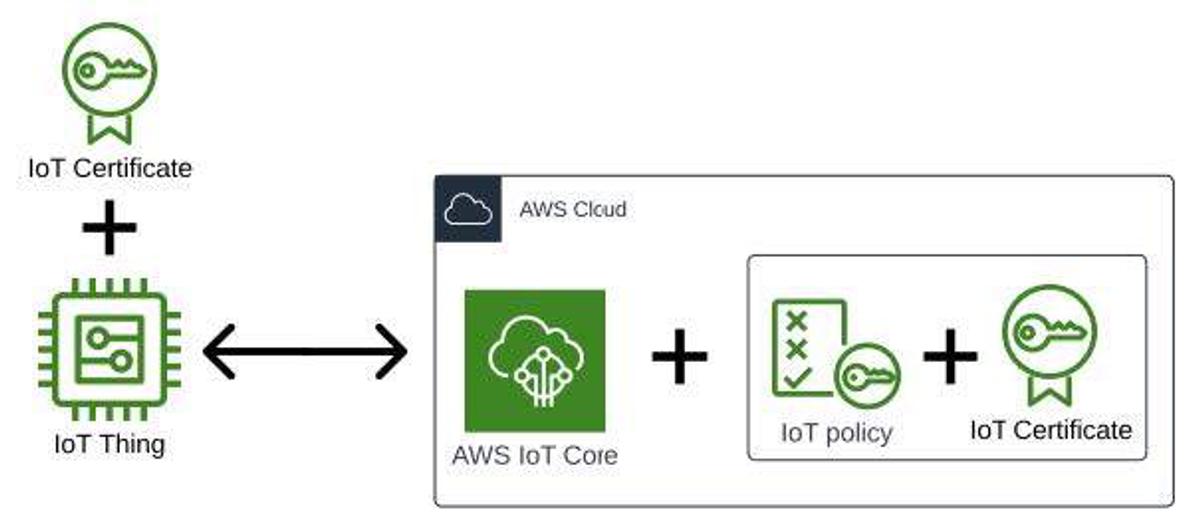 This pairing of an IoT Policy and an IoT Certificate can be visualized in the following manner.