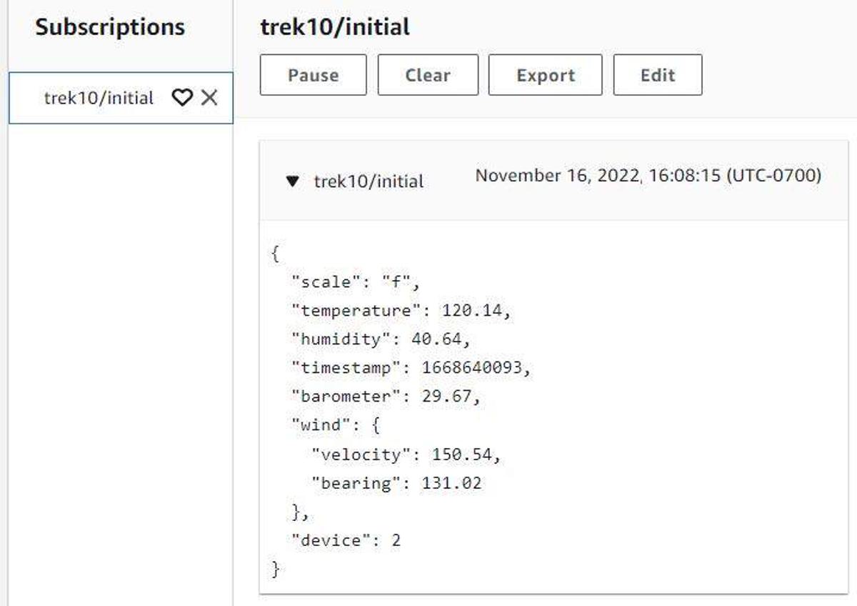 Published message: {"scale": "c", "temperature": -1.73, "humidity": 57.77, "timestamp": 1668640090, "barometer": 31.52, "wind": {"velocity": 106.49, "bearing": 282.75}, "device": 1}