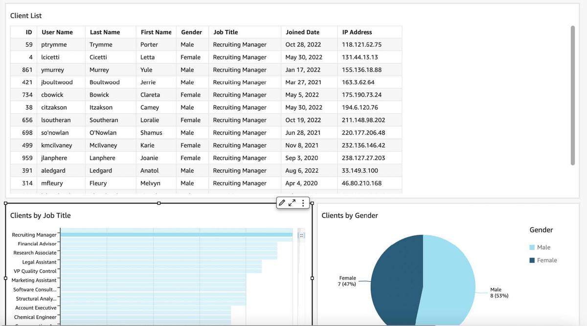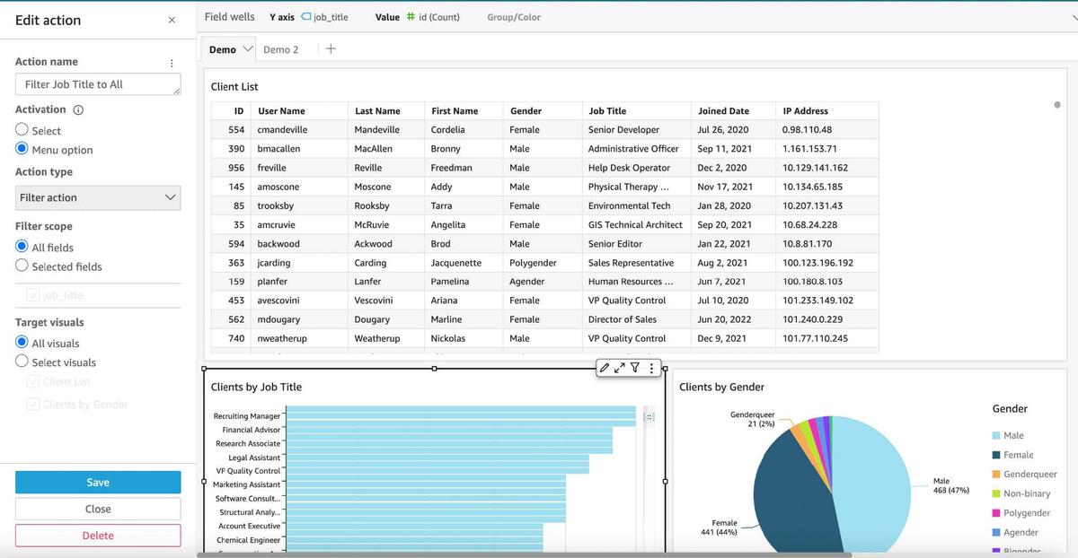 Example: Adding a custom action in the Clients by Job Title visual so that upon selection of a job it filters Clients List and Clients by Gender.