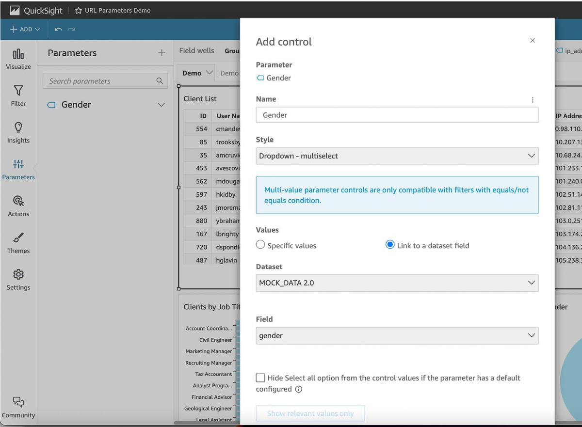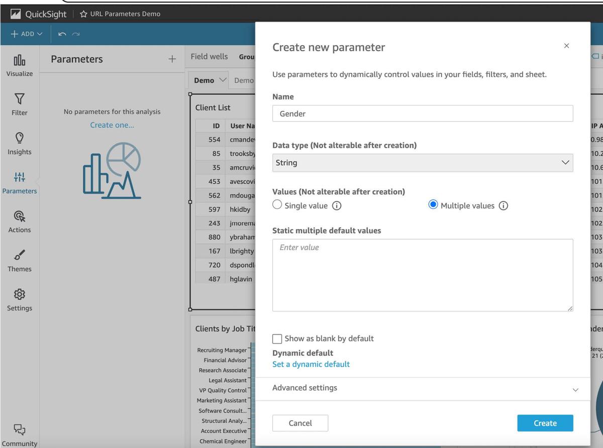 The QuickSight definition of a parameter is “a named variable that can transfer a value for use by an action or an object”. Parameters shine as much as you want them to by using them in the multiple ways that the QuickSight environment allows you to. When it comes to filtering, there are multiple strategies to leverage parameters and bring filtering in your dashboards to the next level. Below are three main implementations of parameters for filtering.