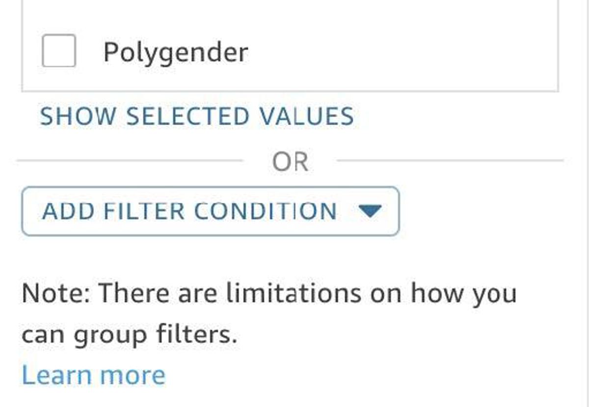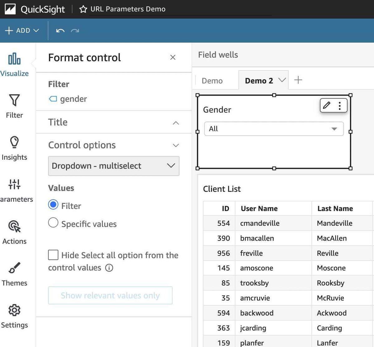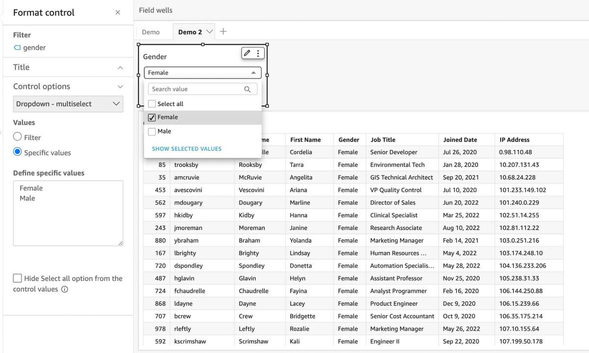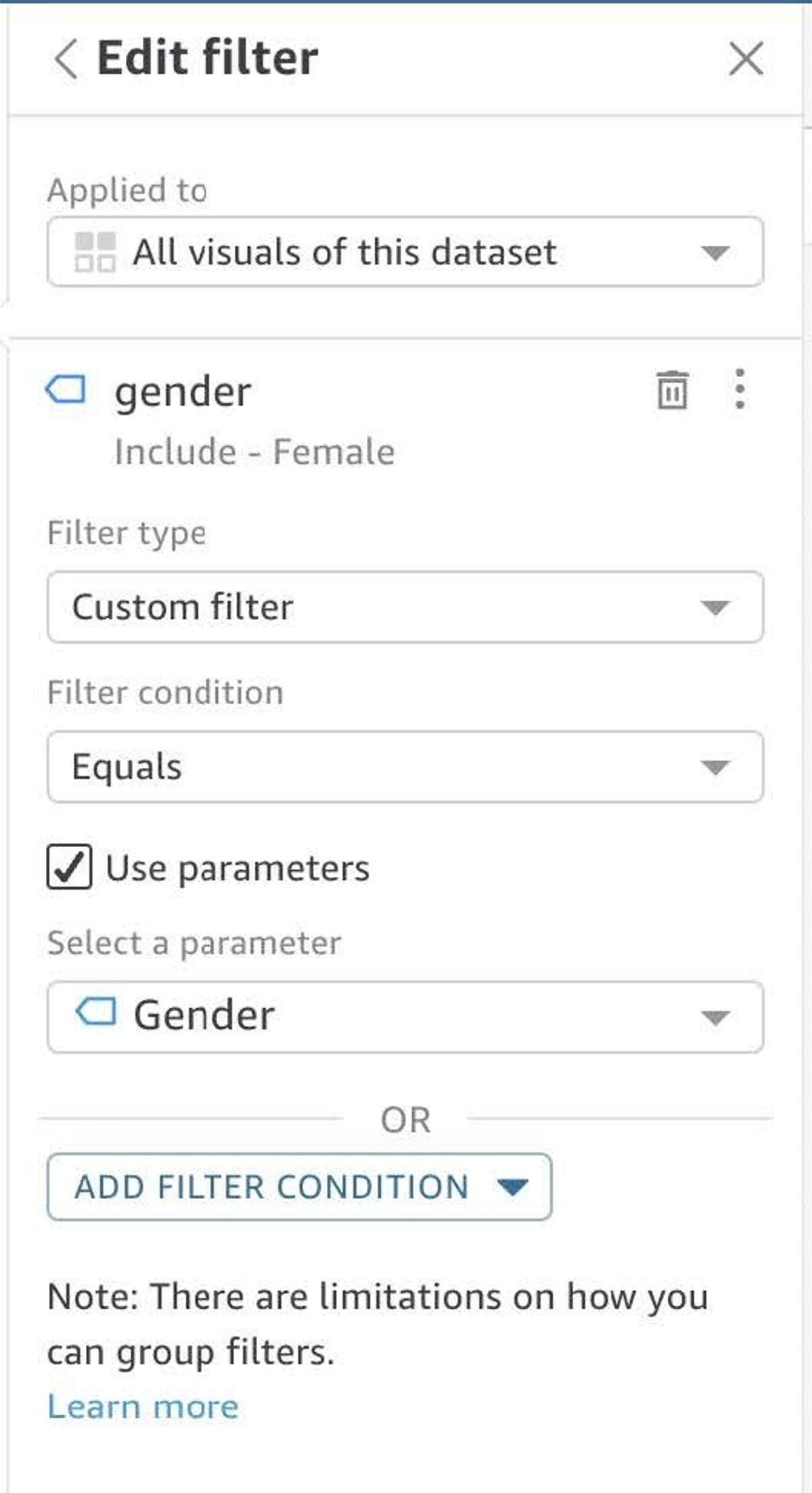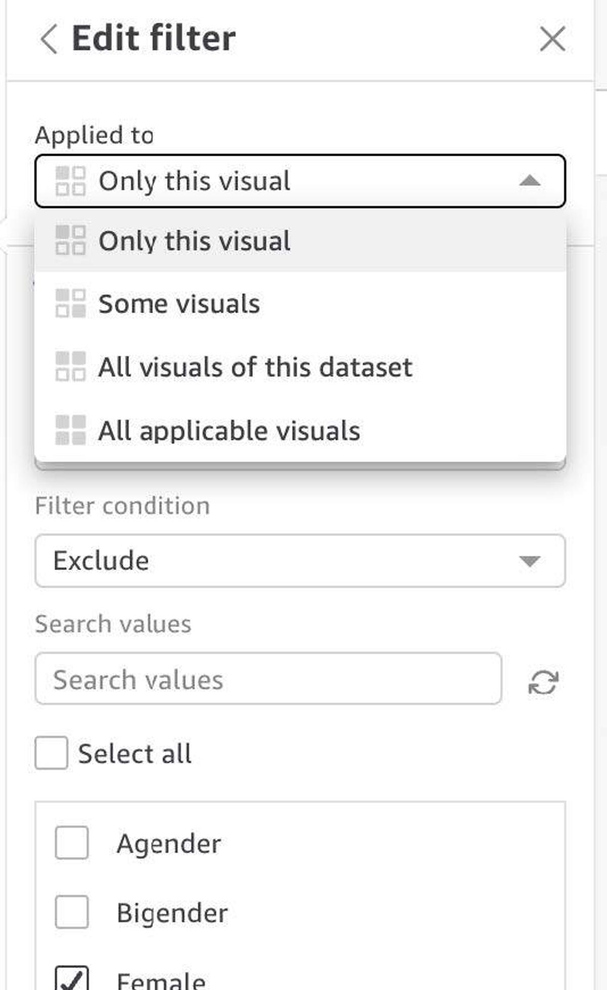 Once you have chosen what filter type you are using, note that you have two options: Filter and Specific values. The filter option will include ALL distinct values that QuickSight finds in that field. Specific values allow you to list what values the user will see in the filter that gets added to the visual. In the example, listing Female and Male will mean that unless the user selection is Select all, the user will automatically filter out the rest of genders.