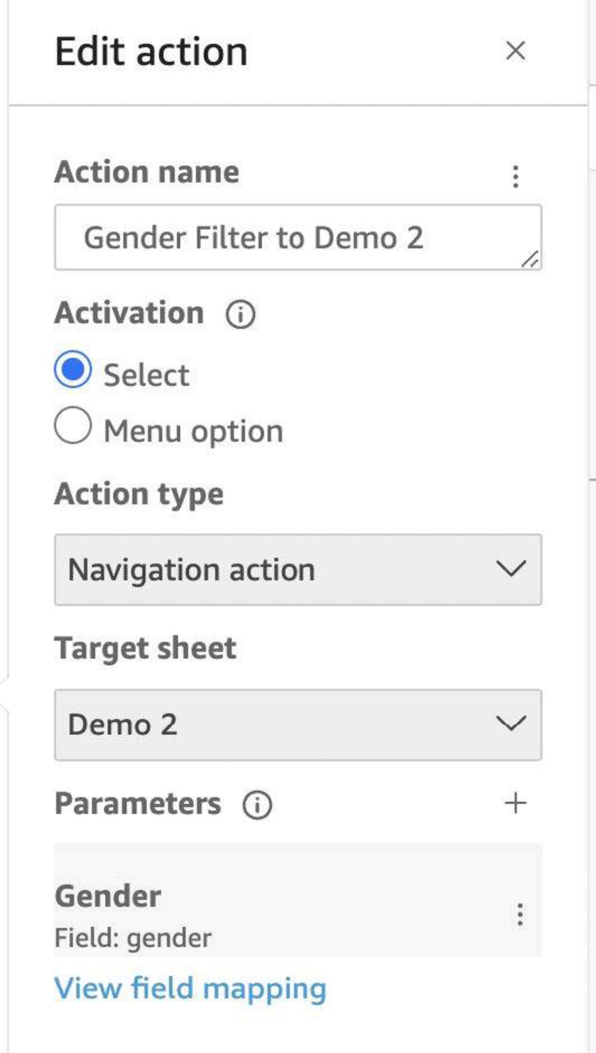 One of the most interesting features of filter actions is automatically filtering the identical fields from different datasets in your sheet. As a reminder, you initially create analysis from a single dataset but have the ability to create visuals using other distinct datasets in the very same sheet. QuickSight automatically does this matching through field mappings for fields that exist in the multiple datasets being used. At the bottom of the action menu, the view field mapping option will open up a screen that displays the mapping between the initial dataset (one you have created the current visual with) and all the other datasets. This can be a very useful feature and the ability to filter across datasets can be taken to a whole new level through the use of Parameters.