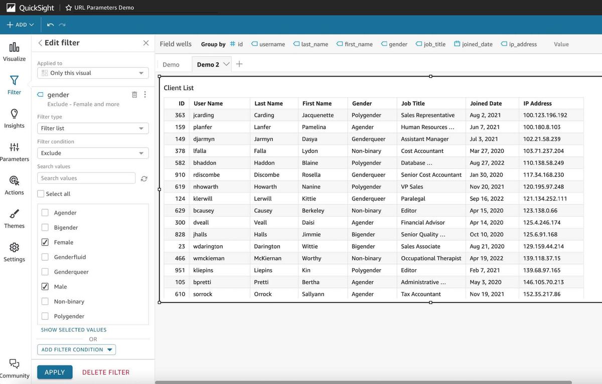 Visual selection is very important when creating and applying filters. In the example above, the filter for gender is only applied to the Client List visual since it was the one that was selected upon creation.