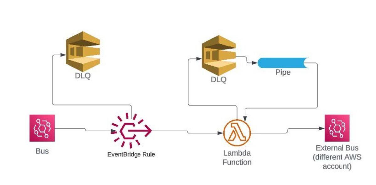 As seen above, we might consider placing an EventBridge pipe between an SQS queue serving as a DLQ and a Lambda consumer, in order to allow for “redrive” functionality of those failed events back into the Lambda consumer. One could ask “Why not use the existing features in Lambda which already allow for SQS->Lambda integration?” This is a fair point, however, the only issue with this is that now the Lambda would need to be adjusted to support both invocations from SQS and EventBridge. The events the Lambda receives from either service differ in their format. You might expect me to say here “This is where EventBridge Pipes come in and allow for integration without code changes.” Unfortunately, this is not the case, because the Pipes feature is not quite that magical. To use EventBridge Pipes in this scenario, some minimal code changes will still be required. The only benefit here is that Pipes support Implicit body data parsing, which will save you from having to include a single JSON.parse call in your handler. If we are committed to supporting redrive functionality from the DLQ that mimics existing EventBridge Rule invocations as closely as possible, we might use something like this: