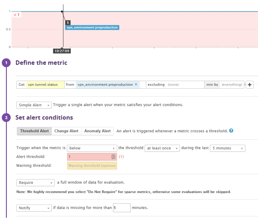 vpn.tunnel.status metric. The vpn.tunnel.status metric is the custom metric being imported into Datadog (a 1 or a 0). We want the min by metric, which means that Datadog will take the minimum value across each of the tunnel’s metrics. For example, if the controller has 30 tunnels configured, each minute has 30 different data points of 1 or 0. If any of those 30 tunnels post a 0, Datadog uses that metric when evaluating the alert conditions.vpn_environment:production tag. The Lambda function posts the custom metric to Datadog and creates the tag key of vpn_environment. The value of this tag is equal to the VPNENV environment variable in the Lambda function config. If you are using multiple Lambda functions to monitor different VNS3s, then you would change this tag to the appropriate value based on which controller you are monitoring.Simple Alert. If you would like to receive an alert for each individual tunnel (with the {{tunnel.name}} value pulled into the alert), you can choose Multi Alert. The downside to Multi Alert is that if the connection to your IPsec peer(s) drop, you will receive a noisy, separate alert for each tunnel that goes down vs. one generic alert.Below is a screenshot of what a monitor might look like in the Datadog console:
