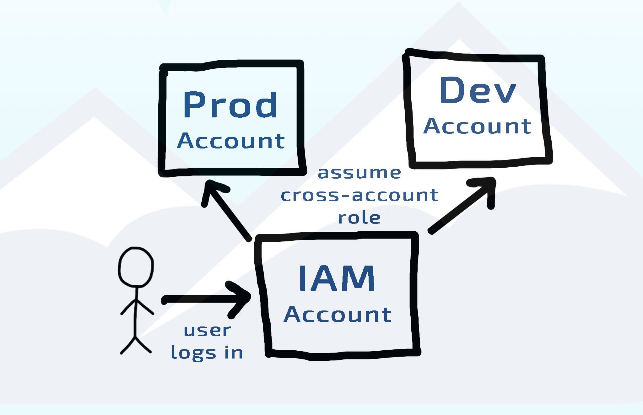 If you’re not already familiar with basic concepts of AWS IAM, including users, groups, policies, and cross-account roles, read up on those first. Here is a great overview. A well-established best practice for IAM is to centralize your users in either a special “IAM only” AWS account or through some user store and SSO service outside of AWS (i.e. Active Directory or Okta) and then use cross-account roles with various access levels to access your organization’s AWS accounts. The scheme looks something like this: