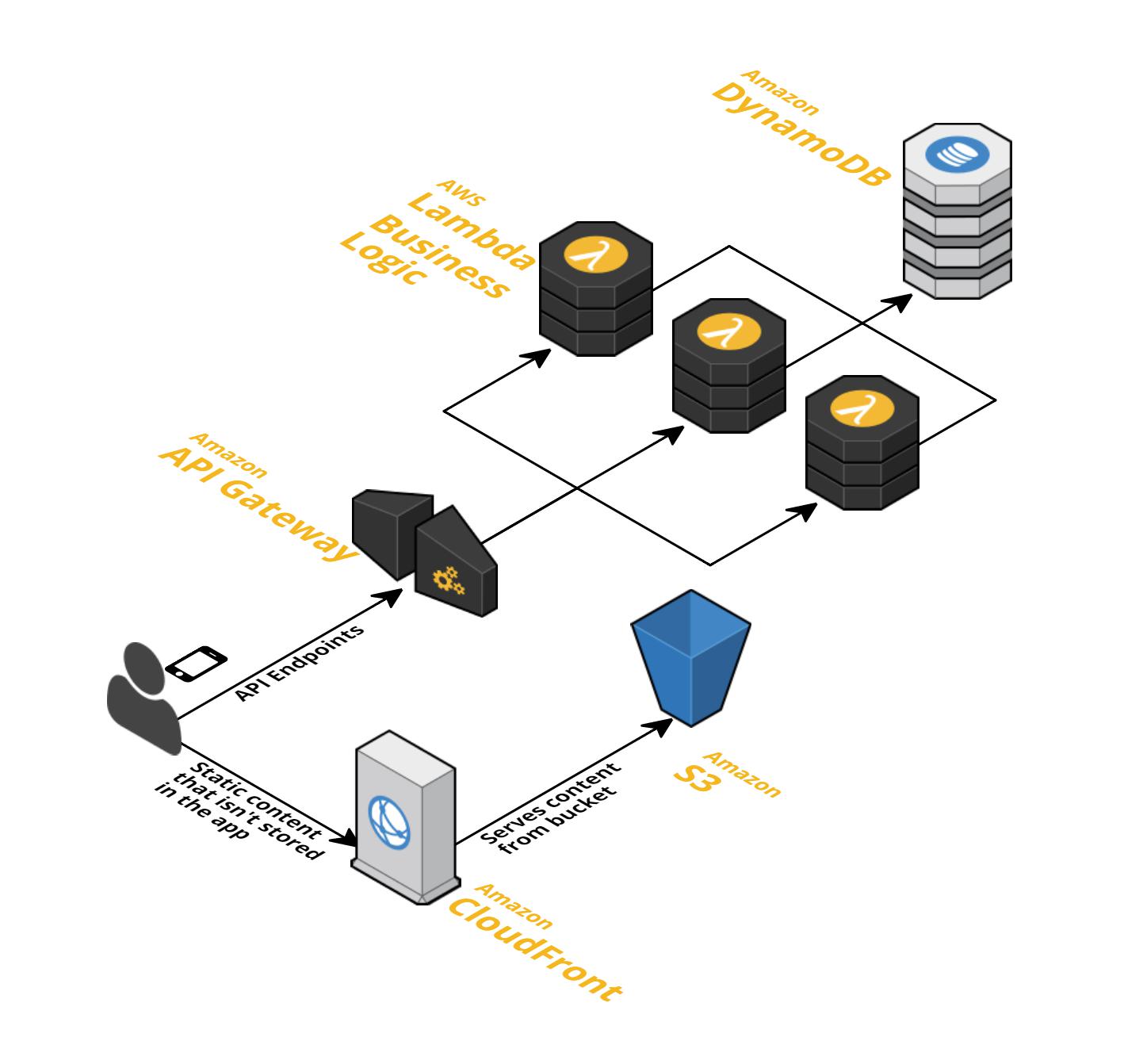You would set up endpoints on API Gateway and have them route to different Lambda functions based on the request being made. Those requests would hit DynamoDB to get and set state for the player or the world around the player. You could use geospatial indexes in DynamoDB for finding collectable objects in the real world. The requests then could be secured by either Auth0{:target=”blank”} or Amazon Cognito{:target=”blank”}. If there is any static content that you don’t want stored in the app (news about the game and company come to mind), you can have it delivered with CloudFront and S3.