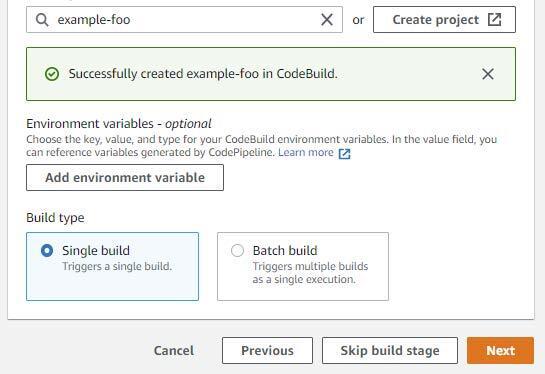 Accept the remaining defaults and click “Next” once you have returned to the “Add build stage” step and verify that your CodeBuild project was successfully created.
