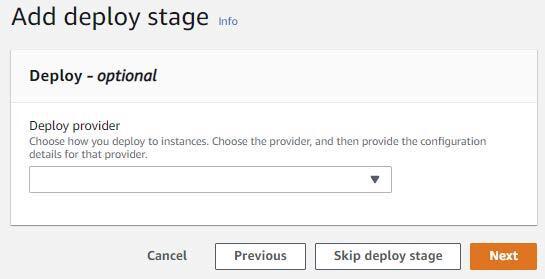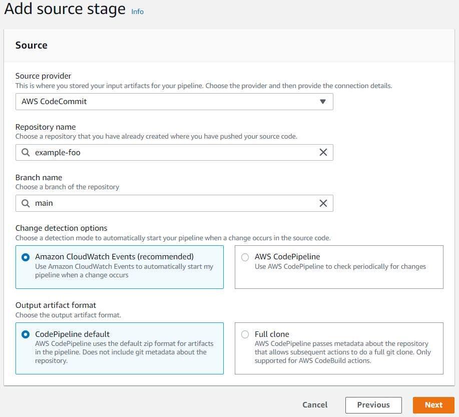 Click “Next” to progress to the “Add source stage” step of the workflow, choose “AWS CodeCommit” for the source provider, and select the appropriate repository name and branch name from your CodeCommit repository. Leave the remaining defaults selected.