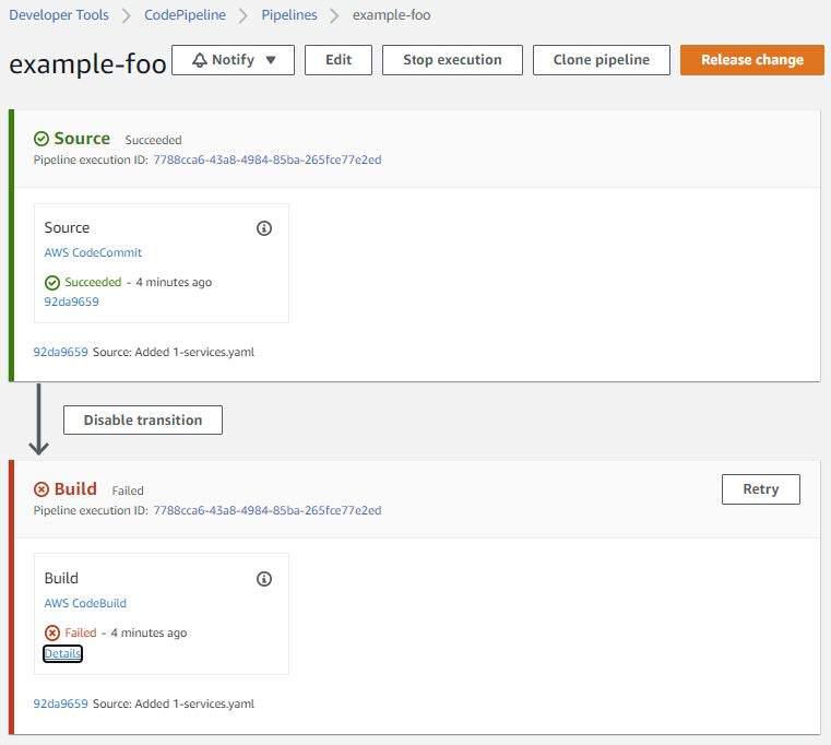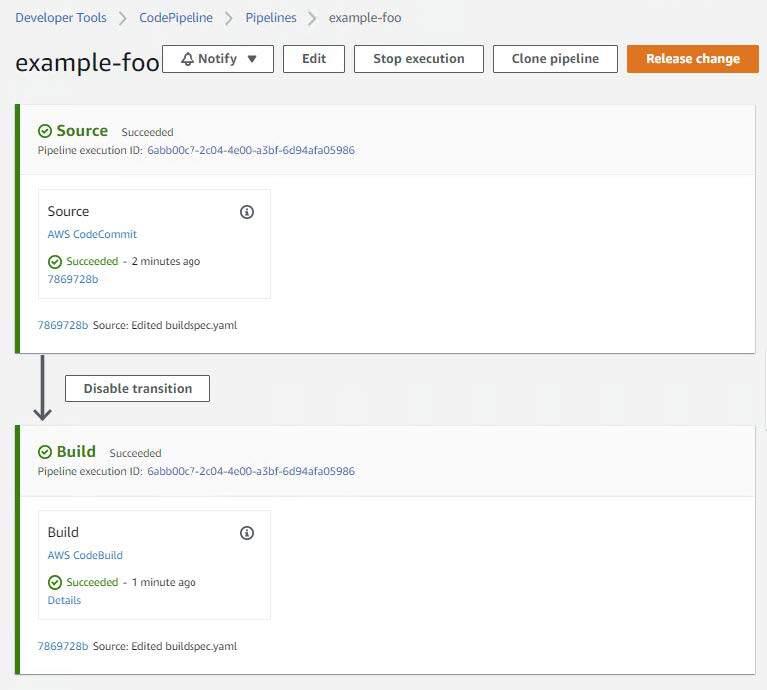 Edit buildspec.yaml and set this variable to whatever you named your EKS cluster. Commit and push your changes to the repository. This commit will trigger the CodePipeline pipeline. You should eventually be presented with successful Source and Build stages within your CodePipeline. Something like the following.