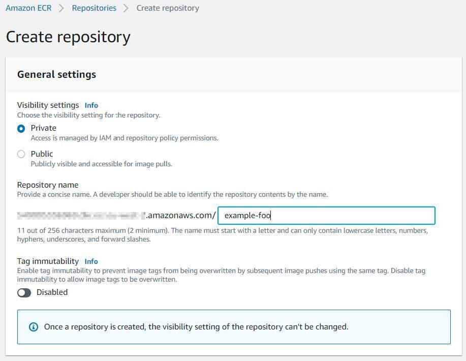 Open the following URL and create an ECR repository. Make sure to set the “region” subdomain and query string parameter to the appropriate region.
