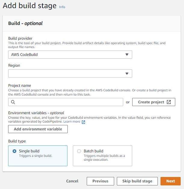 Click “Next” to progress to the “Add build stage” step of the workflow, choose “AWS CodeBuild” as the build provider, make sure your region is set appropriately, and then create a CodeBuild project by clicking the “Create Project” button.