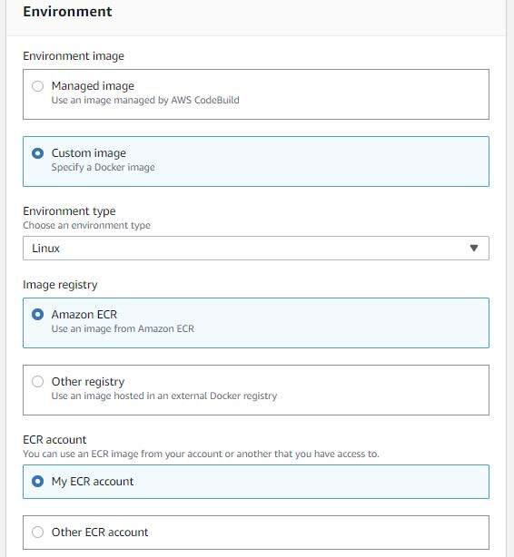 Select “Custom image” for the environment image and “Linux” for the environment type. Make sure “Amazon ECR” and “My ECR account” are selected for the image registry and ECR account (respectively).