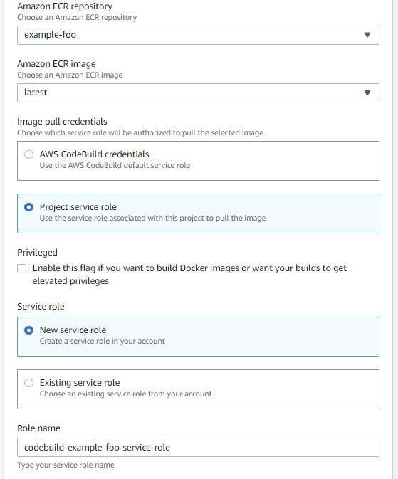 Choose your ECR repository and the tag you assigned to your uploaded container image. Make sure “Project service role” and “New service role” are selected for the image pull credentials and service role (respectively). Accept the default role name.