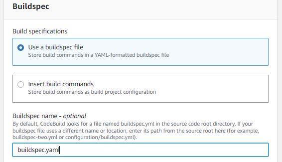 Select “Use a buildspec file” and input “buildspec.yaml” in the buildspec name.