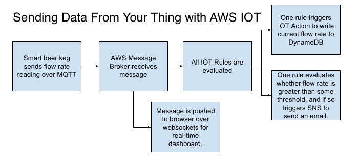 So how does this work? Let’s start with sending data from the thing to your back-end. For example, maybe you want your smart beer keg to send flow data back to your database and real-time dashboard!