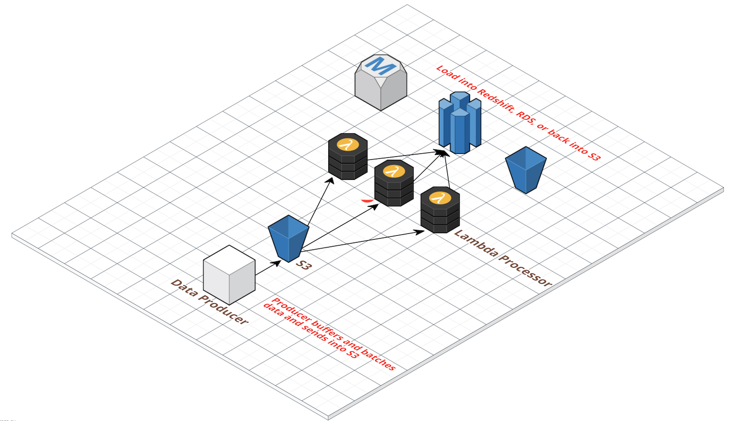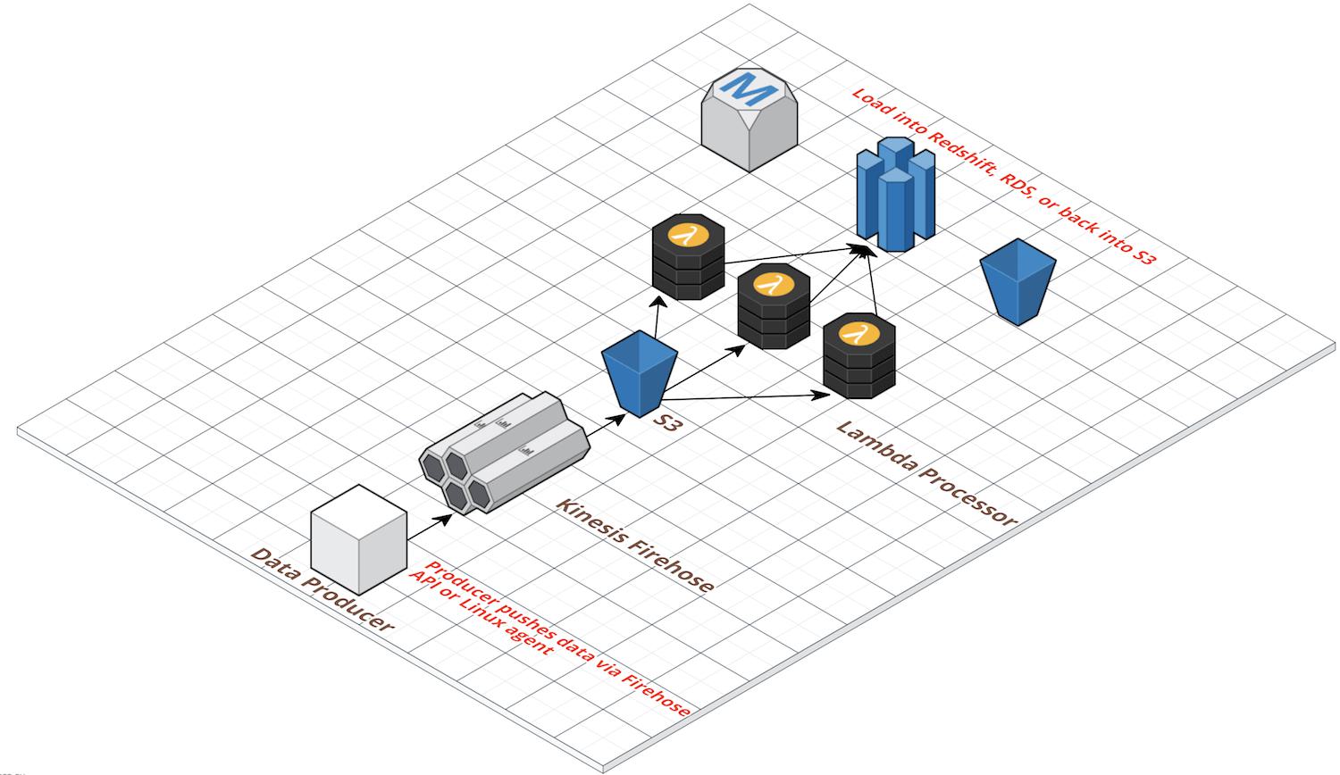 In its most basic form, your data producer (i.e. a web app or client system) pushes data periodically to S3 in some flat file format. This S3 event triggers a Lambda function which processes the data and pushes it into the final destination, such as Redshift, another SQL database, or perhaps back into S3 in some archived form.