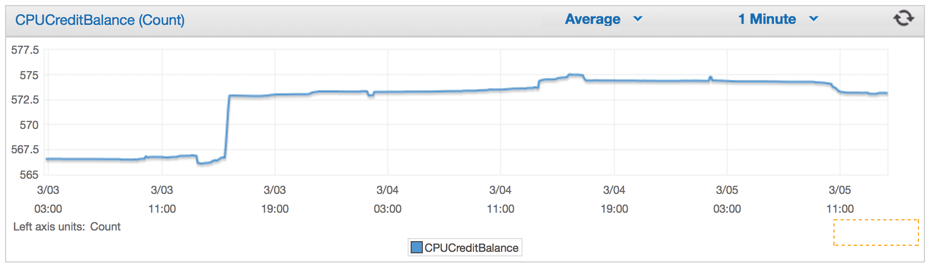 Imagine you start the instance on Friday. Very quickly over the weekend, it builds up a full 576 credits. Then on Monday morning, higher user activity begins on your app and CPU begins using over 20% on each of 2 cores.
