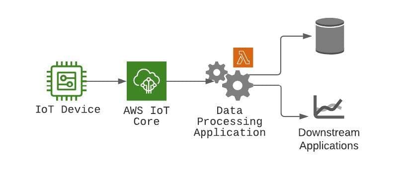 First up, let’s take a look at what is probably the most common design pattern that we see: IoT devices publish messages into AWS IoT Core and a rule sends the data directly to an AWS Lambda function for processing activities such as data validation, for example.