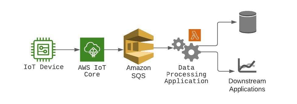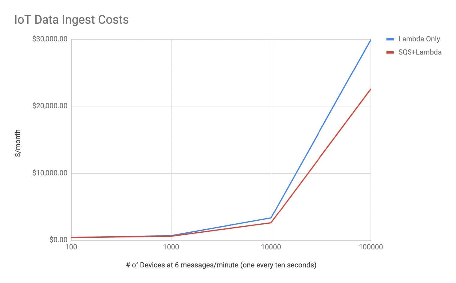 The second pattern consists of inserting an SQS queue between AWS IoT Core and AWS Lambda. Batching device messages in this way allows the Lambda function to process multiple messages at once, which results in up to a 37% cost reduction at higher volumes. Furthermore, SQS provides some useful messaging capabilities like message locking, auto-scaling, and 14-day message retention.