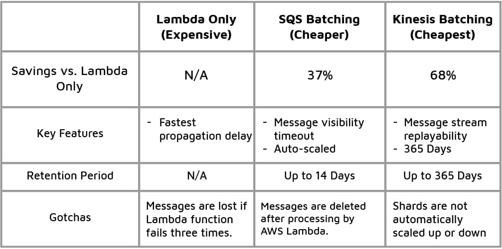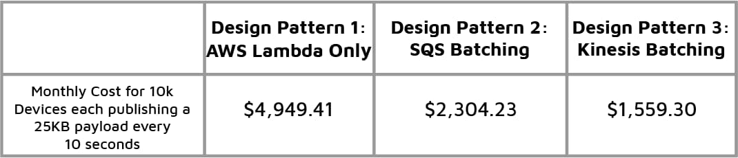 Below we list the cost of Kinesis Batching and compare it with the two previous design patterns: