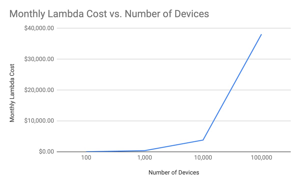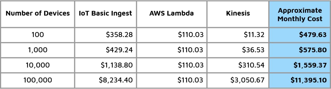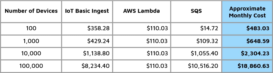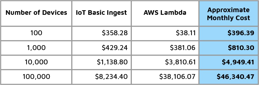 Table 1 - Costs of AWS IoT Basic Ingest + AWS Lambda with 256MB of memory and 300ms average execution time–graphed in the following chart.